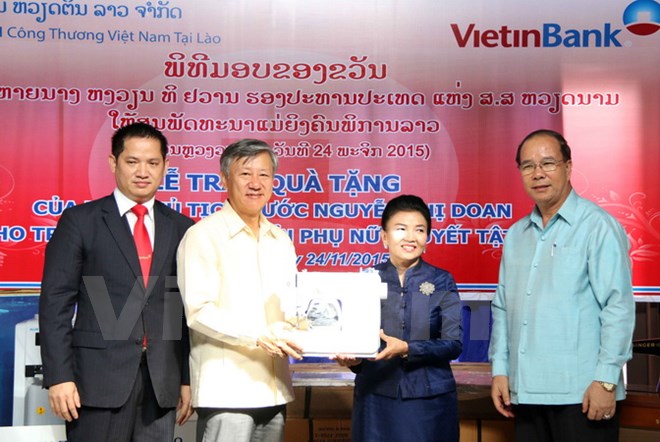 | Đại sứ Việt Nam tại Lào Nguyễn Mạnh Hùng đã trao quà tặng của Phó Chủ tịch nước Nguyễn Thị Doan dành tặng Trung tâm Phát triển phụ nữ khuyết tật Lào. (Ảnh: Phạm Kiên/Vietnam+) |