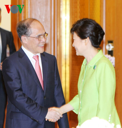 Chủ tịch Quốc hội Nguyễn Sinh Hùng và Tổng thống Park Geun-hye vui mừng nhận thấy quan hệ Việt Nam - Hàn Quốc trong 21 năm qua không ngừng được củng cố, phát triển sâu rộng trên tất cả các lĩnh vực. Hai nước đã trở thành đối tác hiểu biết và tin cậy lẫn nhau. Chủ tịch Quốc hội Nguyễn Sinh Hùng khẳng định, lãnh đạo và nhân dân Việt Nam luôn coi trọng và không ngừng thúc đẩy quan hệ hữu nghị, hợp tác và đối tác chiến lược với Hàn Quốc. Tổng thống Park Geun-hye nhất trí và đánh giá cao các thành tựu phát triển kinh tế, xã hội của Việt Nam trong thời gian qua và hài lòng về sự phát triển quan hệ hợp tác giữa hai nước, đặc biệt là từ khi hai bên nâng cấp quan hệ thành đối tác hợp tác chiến lược vào năm 2009. Hai nhà lãnh đạo cũng nhất trí tiếp tục duy trì và tăng cường các chuyến thăm và tiếp xúc giữa lãnh đạo cấp cao, các cấp, các ngành và địa phương hai nước, góp phần củng cố và tăng cường sự tin cậy chính trị; Tăng cường hơn nữa quan hệ kinh tế, nhất là trên các lĩnh vực đầu tư, thương mại, hợp tác phát triển, lao động, du lịch. Hai nước tạo mọi điều thuận lợi cho doanh nghiệp hợp tác, tìm kiếm thị trường và cơ hội đầu tư.
