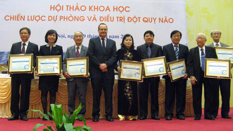 | GS Stephen Davis, Chủ tịch Tổ chức đột quỵ thế giới trao bằng khen cho các giáo sư, bác sĩ Việt Nam. (Ảnh:Thu Thủy) |