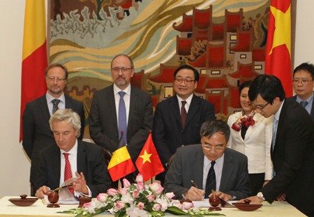 | Phó Thủ tướng Hoàng Trung Hải và Phó Thủ tướng Vương quốc Bỉ chứng kiến ký kết các văn kiện hợp tác (Ảnh: TTXVN) |