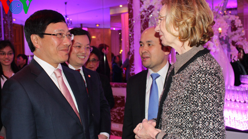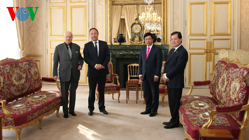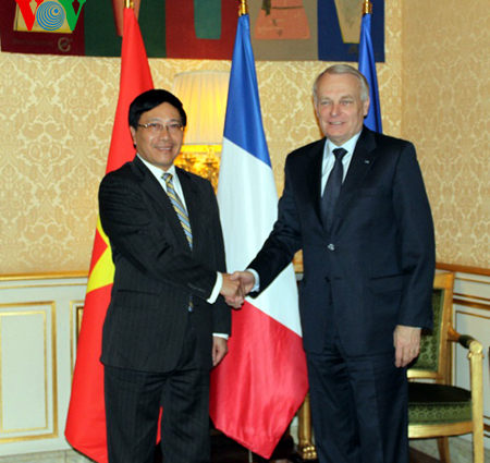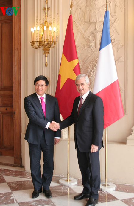 Bộ trưởng Ngoại giao Phạm Bình Minh bày tỏ vui mừng đến thăm chính thức Pháp; khẳng định chính sách nhất quán của Việt Nam luôn coi trọng và mong muốn tăng cường quan hệ hợp tác với Pháp, đối tác chính trị, kinh tế, thương mại – đầu tư và hợp tác phát triển quan trọng hàng đầu của Việt Nam trong Liên minh châu Âu (EU).