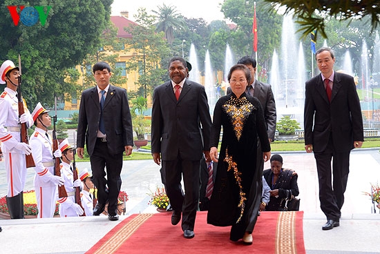 | Phó chủ tịch nước Nguyễn Thị Doan đón tổng thống Ali Mohamed Shein (Ảnh: Huy Phương) |