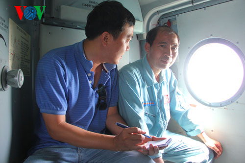 | Phóng viên Thanh Tùng trao đổi thông tin với thành viên kíp bay |