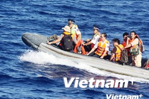 | Các nhà báo vượt sóng Hoàng Sa. (Ảnh: Sơn Bách/Vietnam+) |