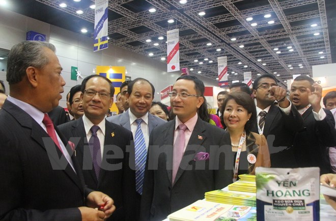 | Phó Thủ tướng Malaysia Muhyiddin Yassin (đi đầu) và Tổng Thư ký ASEAN Lê Lương Minh (thứ hai) thăm gian hàng của Việt Nam. (Ảnh: Kim Dung-Chí Giáp/Vietnam+) |