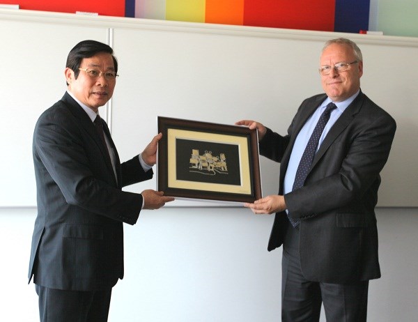 | Bộ trưởng Nguyễn Bắc Son tặng quà lưu niệm ông Steve Unger - Phó Chủ tịch OFCOM (Ảnh: Vietnam+) |