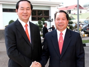 | Bộ trưởng Thongban SengAphon đón Bộ trưởng Trần Đại Quang. (Ảnh: Hoàng Chương/Vietnam+) |