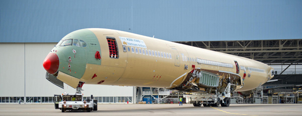| Thân chiếc A350XWB đầu tiên của Vietnam Airlines chuyển vào dây chuyền lắp ráp hoàn chỉnh - Ảnh: Airbus |