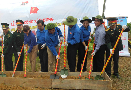 | Các đại biểu động thổ khởi công xây dựng công trình cột cờ Tổ quốc trên đảo Trần. |
