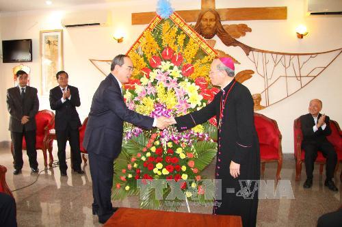 Ông Nguyễn Thiện Nhân chúc mừng Giáng sinh tại Tòa Giám mục Xuân Lộc. Ảnh: TTXVN