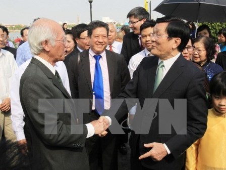 | Chủ tịch nước Trương Tấn Sang với các kiều bào. (Ảnh: Nguyễn Khang/TTXVN) |