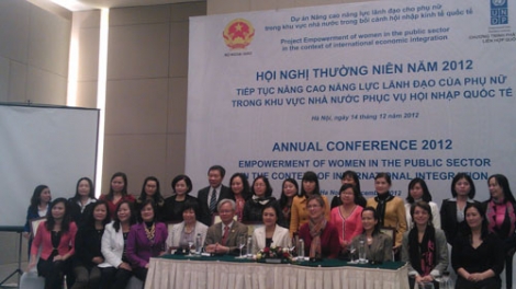 (VOV5)- Sáng nay (14/12) tại Hà Nội khai mạc Hội nghị thường niên của Dự án “Nâng cao năng lực lãnh đạo cho phụ nữ trong khu vực nhà nước trong bối cảnh hội nhập kinh tế quốc tế”. Hội nghị nhằm đánh giá kết quả triển khai dự án, trao đổi về những vấn đề đặt ra về nâng cao năng lực lãnh đạo của phụ nữ trong khu vực nhà nước, từ đó xây dựng chương trình hoạt động năm 2013 và phương hướng hoạt động trong giai đoạn 2 đến năm 2016.