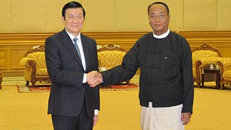 (VOV5)- Ngày 30/11, trong khuôn khổ chuyến thăm cấp Nhà nước tới Myanmar, Chủ tịch nước Trương Tấn Sang đã tiếp Chủ tịch Thượng viện Myanmar Khin Aung Myint và Chủ tịch Hạ viện Myanmar Thura Swe Mann tại thủ đô Nay Pi Taw. Chiều cùng ngày, Chủ tịch nước đã thăm cố đô Yangon, dự và phát biểu tại Diễn đàn Doanh nghiệp Việt Nam - Myanmar; thăm Trụ sở Ngân hàng Đầu tư và Phát triển Việt Nam (BIDV) và Hiệp hội các nhà đầu tư Việt Nam tại Myanmar (AVIM); và tiếp Thủ hiến vùng Yangun Myint Swe.
