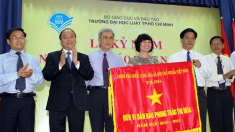 (VOV5)- Sáng nay (18/11), Phó Thủ tướng Chính phủ Nguyễn Xuân Phúc dự lễ kỷ niệm lần thứ 30 Ngày Nhà giáo Việt Nam (20/11) tại trường Đại học Luật Thành phố Hồ Chí Minh và trao Cờ thi đua của Chính phủ cho trường này.