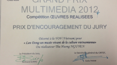 (VOV5) - Hội đồng quốc tế các đài phát thanh truyền hình Pháp ngữ (CIRTEF) vừa trao giải khuyến khích cuộc thi Giải thưởng lớn đa phương tiện 2012 (Grand Prix Multimedia 2012) cho phóng sự "Lên đồng - bảo tàng sống của văn hoá Việt Nam" của tác giả Nguyễn Thu Hương, thuộc Hệ Phát thanh đối ngoại-VOV5.