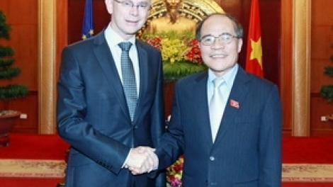 (VOV5) - Tại cuộc hội kiến với Chủ tịch Hội đồng châu Âu (EU) Herman Van Rompuy, diễn ra sáng nay, tại Hà Nội, Chủ tịch Quốc hội Nguyễn Sinh Hùng đánh giá cao vai trò và vị thế quốc tế của Liên minh Châu Âu và khẳng định, Việt Nam luôn coi Liên minh Châu Âu là đối tác ưu tiên hàng đầu trong chính sách đối ngoại và mong muốn “xây dựng quan hệ đối tác bình đẳng, hợp tác toàn diện và lâu dài vì hòa bình và phát triển của khu vực và trên thế giới” với EU.