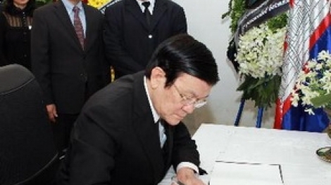 (VOV5) - Ngày 19/10, Chủ tịch nước Trương Tấn Sang đến đặt vòng hoa kính viếng Thái thượng hoàng Norodom Sihanouk tại nhà riêng Đại sứ Vương quốc Campuchia ở Hà Nội.