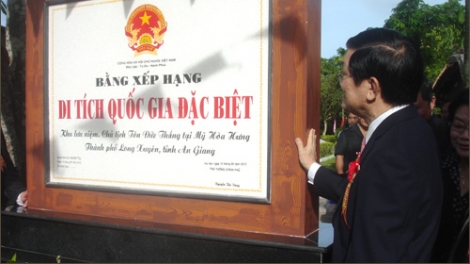 (VOV5) - Sáng nay (17/7), tại xã Mỹ Hòa Hưng, Thành phố Long Xuyên, tỉnh An Giang tổ chức Lễ công bố Quyết định của Thủ tướng Chính phủ về việc xếp hạng Khu lưu niệm Chủ tịch Tôn Đức Thắng là di tích cấp quốc gia đặc biệt. Phát biểu tại buổi lễ, Chủ tịch nước Trương Tấn Sang đánh giá cao những nỗ lực của Đảng bộ, chính quyền và nhân dân tỉnh An Giang đã có công rất lớn trong việc xây dựng, tôn tạo và giữ gìn khu di tích ngày càng khang trang.