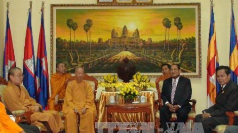 (VOV5) - Chiều 12/06, Bộ trưởng Bộ Nghi lễ và Tôn giáo Vương quốc Campuchia Min Khin đã tiếp Đoàn Giáo hội Phật giáo Việt Nam do Hòa thượng Thích Trí Quảng, Phó Chủ tịch Hội đồng trị sự, Trưởng ban Phật giáo quốc tế Trung ương giáo hội dẫn đầu, đang ở thăm Campuchia từ ngày 11 - 13/6.
