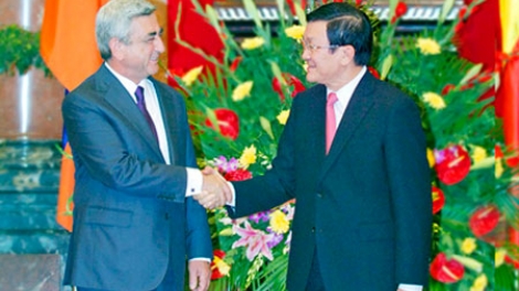 (VOV5) - Chiều tối 8/6, Tổng thống Cộng hòa Armenia Serzh Sargsyan và đoàn đại biểu Armenia đã rời Hà Nội, kết thúc tốt đẹp chuyến thăm chính thức Việt Nam. Trong thời gian thăm Việt Nam, Tổng thống Serzh Sargsyan đã hội đàm với Chủ tịch nước Trương Tấn Sang, chào xã giao Tổng Bí thư Nguyễn Phú Trọng, hội kiến với Thủ tướng Nguyễn Tấn Dũng và Chủ tịch Quốc hội Nguyễn Sinh Hùng.