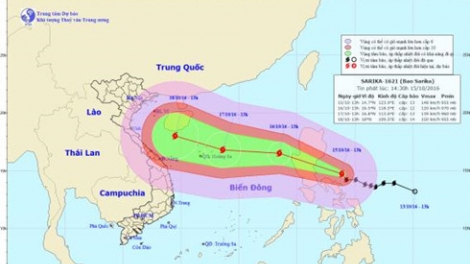(VOV5) - Theo Trung tâm dự báo Khí tượng Thủy văn Trung ương, hồi 16 giờ ngày 16/10, vị trí tâm bão Sarika cách quần đảo Hoàng Sa khoảng 620km về phía Đông.