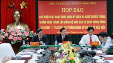 (VOV)- Sáng nay, tại Hà Nội, Đảng bộ Khối các cơ quan Trung ương tổ chức họp báo thông báo Lễ tuyên dương 500 bí thư chi bộ tiêu biểu nhân sẽ được diễn ra vào ngày 10/4, nhân kỷ niệm 64 năm ngày truyền thống Đảng bộ Dân-Chính- Đảng Trung ương và 5 năm ngày thành lập Đảng bộ Khối các cơ quan Trung ương (11/4/2007-11/4/2012).