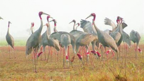 Loài sếu đầu đỏ quý hiếm đang di trú về Khu bảo tồn đồng cỏ bàng Phú Mỹ, tỉnh Kiên Giang.