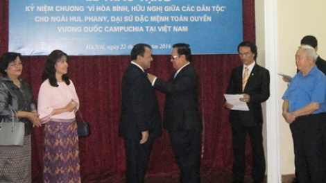(VOV5) - Ngày 22/7, tại Hà Nội, Chủ tịch Liên hiệp các tổ chức hữu nghị Việt Nam Vũ Xuân Hồng trao Kỷ niệm chương “Vì hòa bình hữu nghị giữa các dân tộc” tặng Đại sứ Vương quốc Campuchia Hul Phany