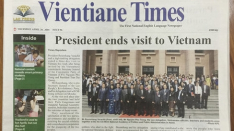 (VOV5) - Trên trang nhất các tờ báo tại Lào số ra ngày 28/04 đăng nhiều tin, bài, ảnh và toàn văn Tuyên bố chung Việt Nam – Lào về chuyến thăm hữu nghị, chính thức của Tổng Bí thư, Chủ tịch nước Lào Bounnhang Volachith tới Việt Nam từ ngày 25 - 27/04.