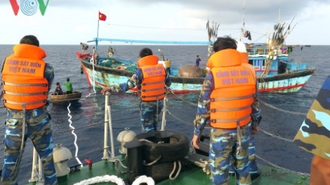 (VOV5) - Sáng 18/4, tàu cá số hiệu QNg 98614TS của ngư dân tỉnh Quảng Ngãi bị hỏng máy trôi dạt trên khu vực đảo Đá Bắc thuộc Quần đảo Hoàng Sa, thành phố Đà Nẵng, được tàu Cảnh sát biển 9002 của Bộ Tư lệnh Vùng Cảnh sát biển 2, lai dắt về bờ an toàn.