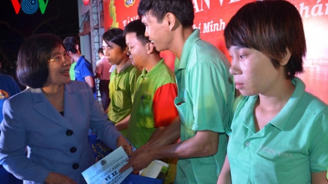 (VOV5) - Liên đoàn Lao động Thành phố Hồ Chí Minh phối hợp với Công đoàn các Khu chế xuất – Công nghiệp tổ chức chương trình thăm, tặng quà cho hơn 2.800 công nhân có hoàn cảnh khó khăn không có điều kiện về quê đón Tết trên địa bàn thành phố trong tối 22/01.