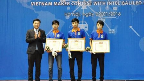 (VOV5) - Tại lễ trao giải cuộc thi "Nhà sáng tạo Việt Nam với Intel Galileo" năm 2015 diễn ra hôm qua, Ban Tổ chức trao giải Nhất cho sản phẩm thiết kế "Hệ thống xe lăn an toàn tích hợp với khả năng cứu hộ" của nhóm sinh viên trường Đại học Sư phạm Kỹ thuật Hưng Yên 2.