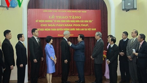 (VOV5) - Chủ tịch Liên hiệp các tổ chức hữu nghị Việt Nam Vũ Xuân Hồng trao Kỷ niệm chương “Vì hòa bình, hữu nghị giữa các dân tộc” cho Đại sứ đặc mệnh toàn quyền Vương quốc Thái Lan tại Việt Nam Panyarak Poolthup vì đã có những đóng góp tích cực trong việc thúc đẩy quan hệ hợp tác, hữu nghị giữa nhân dân Việt Nam và Thái Lan.