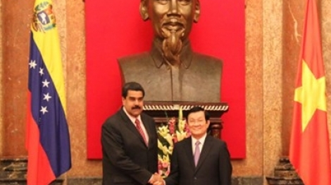 (VOV5) - Nhận lời mời của Chủ tịch nước Trương Tấn Sang, Tổng thống Cộng hòa Bolivar Venezuela Nicolas Maduro Moros và Phu nhân tới Hà Nội bắt đầu thăm chính thức Việt Nam từ ngày 30/8-31/8. Sáng 31/8, sau lễ đón, Chủ tịch nước Trương Tấn Sang và Tổng thống Nicolas Maduro Moros hội đàm.