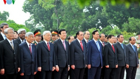 (VOV5) - Đoàn đại biểu Ban Chấp hành Trung ương Đảng Cộng sản Việt Nam, Chủ tịch nước, Quốc hội, Chính phủ, Ủy ban Trung ương Mặt trận Tổ quốc Việt Nam vào Lăng viếng Chủ tịch Hồ Chí Minh và tưởng niệm các Anh hùng liệt sỹ tại Đài tưởng niệm các Anh hùng liệt sỹ.