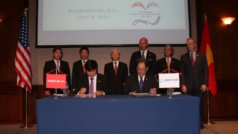 (VOV5)- Ngày 8/7, tại Thủ đô Washington, hãng hàng không thế hệ mới Vietjet và Tập đoàn chế tạo máy bay Boeing (Hoa Kỳ) ký kết biên bản hợp tác.