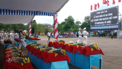 (VOV5) - Ngày 29/5, tỉnh Gia Lai đã tổ chức trọng thể Lễ đón nhận, truy điệu và an táng 30 hài cốt liệt sỹ quân tình nguyện, chuyên gia Việt Nam làm nhiệm vụ quốc tế, hi sinh tại chiến trường Campuchia.