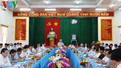 (VOV5) - Tiếp tục chuyến thăm và làm việc tại tỉnh Trà Vinh để kiểm tra việc thực hiện nhiệm vụ phát triển kinh tế - xã hội, công tác xây dựng đảng và việc chuẩn bị đại hội đảng các cấp, chiều qua, 8/3, Tổng Bí thư Ban chấp hành Trung ương Đảng Cộng Sản Việt Nam Nguyễn Phú làm việc với Ban Thường vụ Tỉnh ủy và cán bộ chủ chốt của tỉnh.