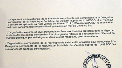 (VOV5) - Trước hành động vi phạm luật pháp quốc tế của Trung Quốc, ngày 6/6, Tổ chức quốc tế Pháp ngữ và Tổ chức UNESCO gửi công hàm cho Phái đoàn thường trực của Việt nam bên cạnh các tổ chức này.