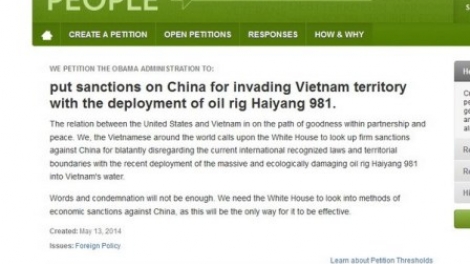 (VOV5) - Tính đến chiều 29/5, có hơn 130.000 người Việt từ khắp mọi nơi trên thế giới ký Thỉnh nguyện thư gửi Nhà Trắng đề nghị Mỹ áp đặt các biện pháp trừng phạt Trung Quốc