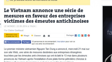 (VOV5) - Tờ Le Monde của Pháp cũng phân tích về tác động của hành động gây hấn của Trung Quốc lên kinh tế Việt Nam.