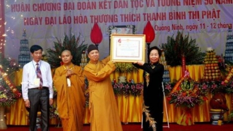 (VOV5) - Phó Chủ tịch nước Nguyễn Thị Doan trao Huân chương Đại đoàn kết dân tộc truy tặng đại lão hòa thượng Thích Thanh Bình qua đại diện Ban trị sự Giáo hội Phật giáo Việt Nam tỉnh Quảng Ninh và thân nhân cố đại lão hòa thượng