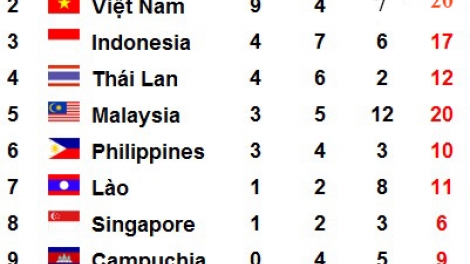 (VOV5) - Trong ngày thi đấu hôm qua (10/12), hai môn Wushu và Vật tiếp tục mang về thêm 3 tấm Huy chương vàng, giúp Đoàn Thể thao Việt Nam vững vàng ở vị trí thứ 2 trên bảng tổng sắp, với 9 Huy chương vàng, 4 Huy chương bạc và 7 Huy chương đồng.
