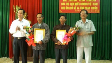 (VOV5) - Thư khen của Chủ tịch nước Trương Tấn Sang gửi cho ông Hồ Sở và ông Phan Thuận ở cùng thôn Phú Khương, xã Hành Tín Tây, huyện Nghĩa Hành, tỉnh Quảng Ngãi, vì đã có hành động dũng cảm cứu nhiều người trong đợt lũ giữa tháng 11 vừa qua.
