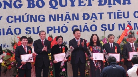 (VOV5) - Ngày 18/11, tại Văn Miếu - Quốc Tử Giám, Hà Nội, Hội đồng chức danh giáo sư Nhà nước tổ chức lễ công bố và trao giấy chứng nhận cho 57 giáo sư và 514 phó giáo sư đạt tiêu chuẩn chức danh giáo sư, phó giáo sư năm 2013.