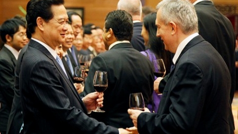 (VOV5) - Nhân kỷ niệm 68 năm Quốc khánh 2/9, tối 30/8, Thủ tướng Nguyễn Tấn Dũng và Phu nhân đã chủ trì tiệc chiêu đãi các vị Đại sứ, Đại biện, Trưởng đại diện các tổ chức quốc tế tại Hà Nội.