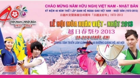 (VOV5) - Lễ hội mùa Xuân Việt - Nhật 2013 sẽ được tổ chức trong 2 ngày 20 và 21/4 tại Trung tâm Hội chợ Triển lãm Việt Nam (148 Giảng Võ, Hà Nội) với nhiều hoạt động văn hóa đặc sắc, hấp dẫn. Đây là hoạt động kỷ niệm 40 năm thiết lập quan hệ ngoại giao giữa Việt Nam và Nhật Bản do Cục hợp tác Quốc tế (Bộ Văn hóa, Thể thao và Du lịch) và Hội Giao lưu Văn hóa Việt - Nhật phối hợp tổ chức.