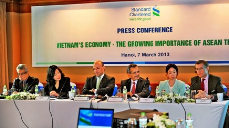 (VOV5) - Trong khuôn khổ các hoạt động bên lề Hội nghị Bộ trưởng Kinh tế ASEAN và các hội nghị liên quan, ngày 7/3, Ngân hàng Standard Chartered tổ chức họp báo với chủ đề “Kinh tế Việt Nam và tầm quan trọng của hợp tác thương mại giữa Việt Nam với các nước trong khu vực ASEAN”. Buổi họp báo có sự tham dự của ông Neeraj Swaroop, Giám đốc điều hành Ngân hàng Standard Chartered khu vực Đông Nam Á, Giám đốc điều hành Standard Charterd tại Indonesia, Philippines, Brunei cùng sự góp mặt của hơn 40 phóng viên đến từ các cơ quan thông tấn báo chí trong nước và quốc tế.