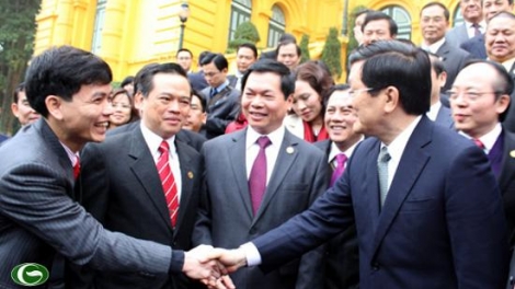 (VOV5) - Các doanh nghiệp Việt Nam cần chú trọng khai thác cả thị trường trong nước và quốc tế, đoàn kết đồng lòng chia sẻ kinh nghiệm để phát triển vì lợi ích của cộng đồng và lợi ích quốc gia - đó là ý kiến chỉ đạo của Chủ tịch nước Trương Tấn Sang khi gặp gỡ lãnh đạo các doanh nghiệp đạt giải thưởng “Thương hiệu quốc gia năm 2012” sáng 7/1 tại Hà Nội.