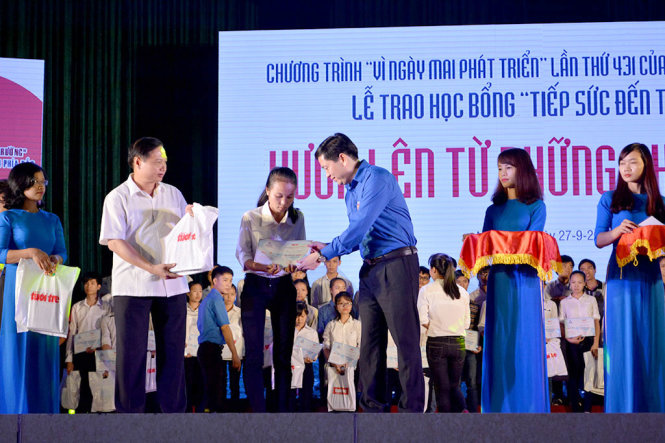 | Ông Nguyễn Long Hải, Bí thư BCH TƯ Đoàn, chủ tịch Hội đồng Đội TƯ, trao tặng các suất học bổng cho tân sinh viên có hoàn cảnh khó khăn. Ảnh: tuoitre. |